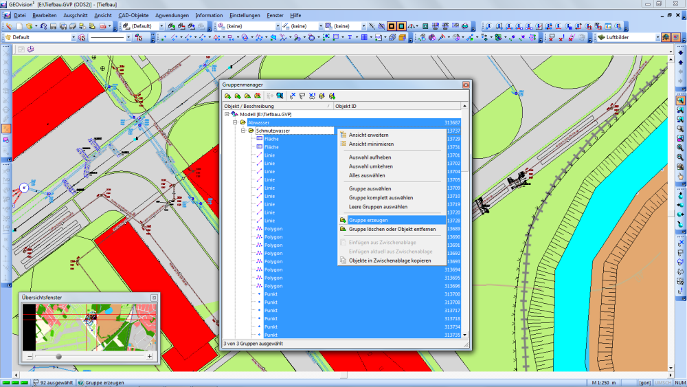 Über den Gruppenmanager werden ausgewählte Grafikobjekte zu Gruppen zusammengefasst, die anschließend gemeinsam wieder verändert werden können. Damit werden die Möglichkeiten zur Massen-Manipulation von Objekten innerhalb von GEOvision³® extrem erweitert. Damit ist nicht nur eine Selektion der Objekte über grafische oder klassische Kriterien möglich, sondern auch eine Selektion über logische Zusammenhänge von Objekten. Den einzelnen Gruppen kann ein aussagekräftiger Name gegeben werden, um das Wiedererkennen zu erleichtern. Innerhalb des Dialogs werden in einer Baumstruktur alle Gruppen des aktuellen Modells aufgelistet. Jedes dazugehörige Objekt ist dabei auch einzeln ansprechbar.